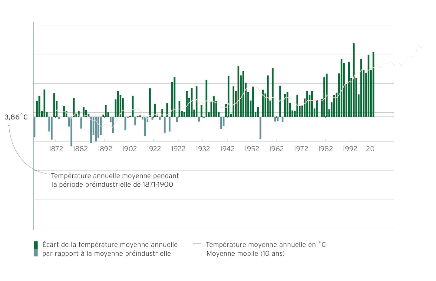 Écart de la température moyenne annuelle par rapport à la moyenne préindustrielle: